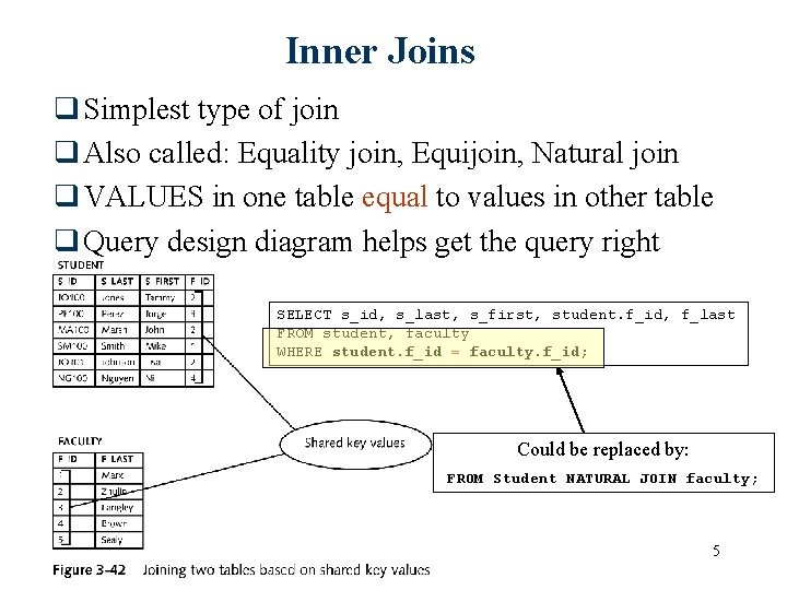Joining Multiple Tables (continued) q Must qualify column name in SELECT clause – Specify name of table that contains column followed by period then column name – Example: SELECT s_id, s_last, student. f_id q Join condition – Specifies table names to be joined and column names on which to join tables – Example: WHERE student. f_id = faculty. f_id 4