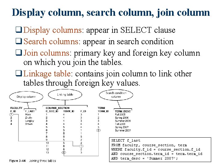 Display column, search column, join column q Display columns: appear in SELECT clause q Search columns: appear in search condition q Join columns: primary key and foreign key column on which you join the tables. q Linkage table: contains join column to link other tables through foreign key values. SELECT f_last FROM faculty, course_section, term WHERE faculty. f_id = course_section. f_id AND course_section. term_id = term_id 6 AND term_desc = 'Summer 2007';
