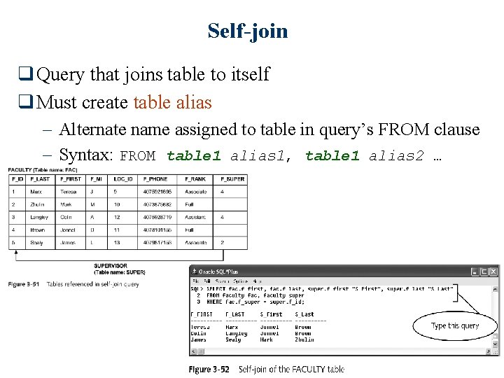 Self-join q Query that joins table to itself q Must create table alias – Alternate name assigned to table in query’s FROM clause – Syntax: FROM table 1 alias 1, table 1 alias 2 … 9