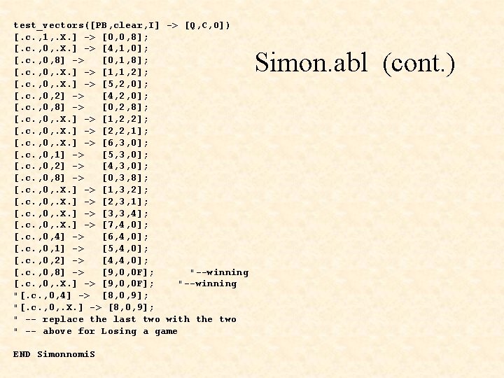 Simon. abl (cont. ) " Definitions QSTATE = [Q 3, Q 2, Q 1, Q 0]; Show. Red = [0, 0, 0, 0]; Show. Blue = [0, 0, 0, 1]; Show. Green = [0, 0, 1, 0]; Show. Yellow = [0, 0, 1, 1]; User. Input 1 = [0, 1, 0, 0]; User. Input 2 = [0, 1, 0, 1]; User. Input 3 = [0, 1, 1, 0]; User. Input 4 = [0, 1, 1, 1]; Lost. Game = [1, 0, 0, 0]; Won. Game = [1, 0, 0, 1];