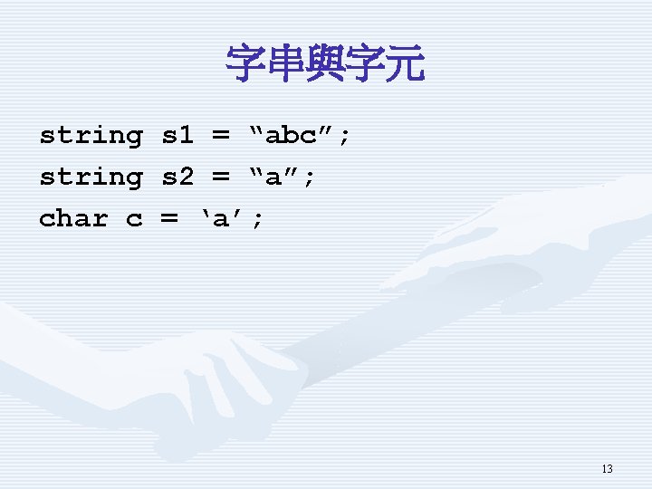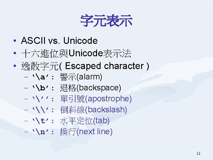 示範程式Using. Char重要片段 char char c 1 c 2 c 3 c 4 c 5 c 6 = = = 'a'; '文'; 'x 0059'; 'u 0058'; 'n'; '''; 11