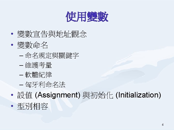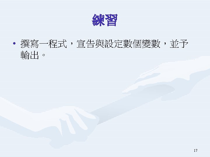 示範程式Using. Variable重要片 段 char a. Char = 'a'; Console. Write. Line(a. Char); int an. Int = 123; Console. Write. Line(an. Int); double a. Double; a. Double = 123. 456; Console. Write. Line(a. Double); bool a. Bool = true; Console. Write. Line(a. Bool); 4