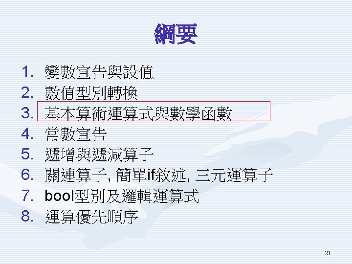 變數設值與型別轉換 • 變數設值 (Assignment) • 隱含轉換 (Implicit conversion) • 強制轉換 (Explicit conversion) 20