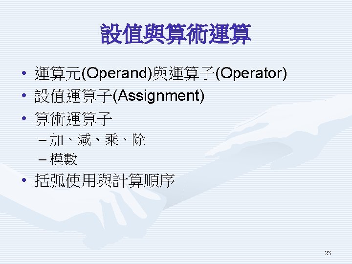示範程式Using. Math. Operator重要片段 Console. Write. Line("請輸入第一個整數值x : "); int x = int. Parse(Console. Read. Line()); Console. Write. Line("請輸入第二個整數值y : "); int y = int. Parse(Console. Read. Line()); Console. Write. Line(" x + y = {0} ", x + y); Console. Write. Line(" x - y = {0} ", x - y); Console. Write. Line(" x * y = {0} ", x * y); Console. Write. Line(" x / y = {0} ", x / y); Console. Write. Line(" x % y = {0} ", x % y); 22
