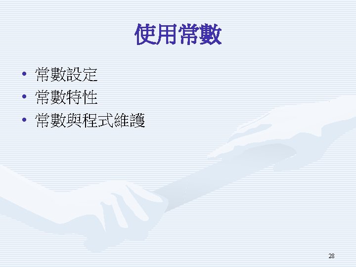 示範程式Using. Constant重要片段 int an. Int = 123; const int A_CONST = 456; an. Int = 321; 27