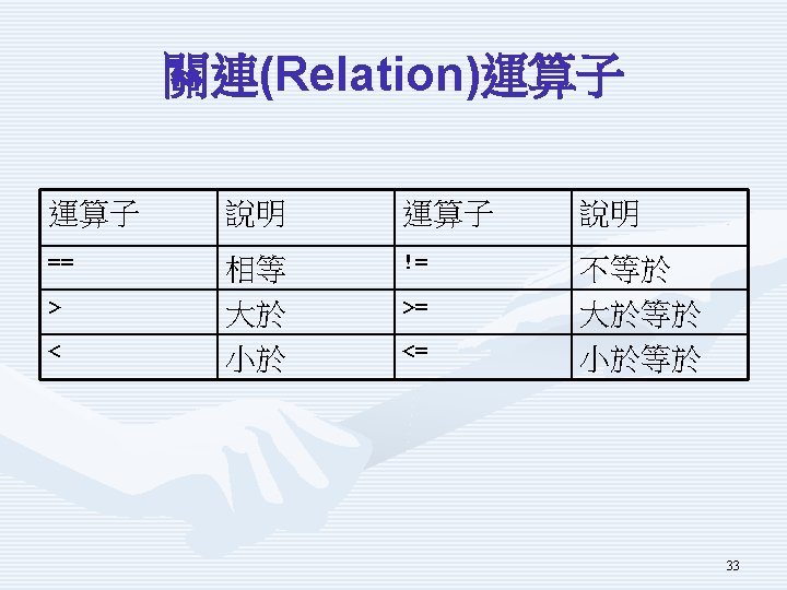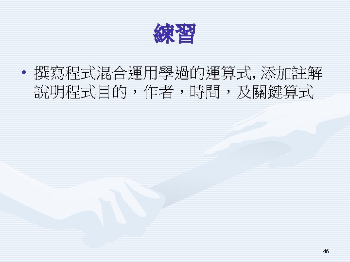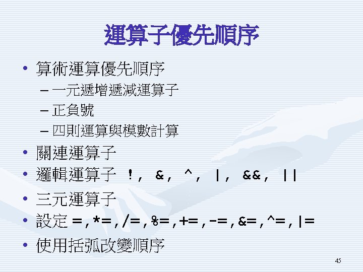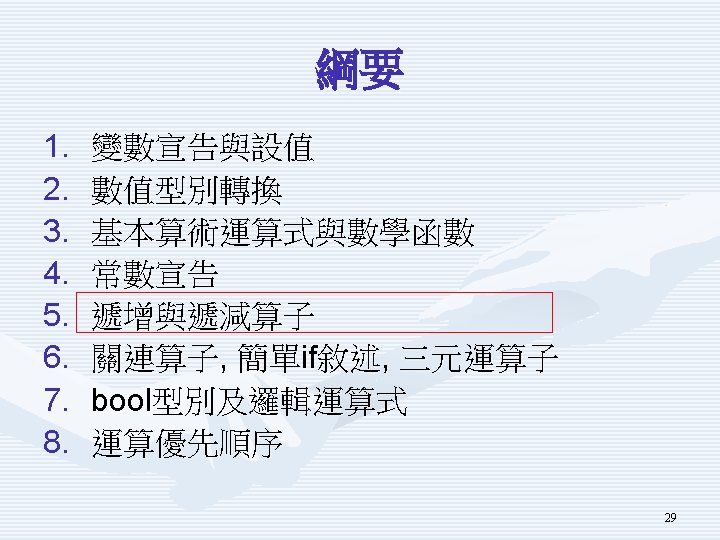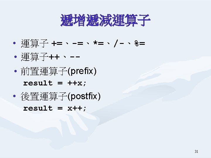 示範程式Using. In. De. Operator重要片段 Console. Write. Line("請輸入整數變數x初值"); int x 0 = int. Parse(Console. Read. Line()); Console. Write. Line("請輸入所要加總的整數值add"); int add = int. Parse(Console. Read. Line()); int x = x 0; x = x + add; x = x 0; x += add; int post; x = x 0; post = x++; int pre; x = x 0; pre = ++x; 30