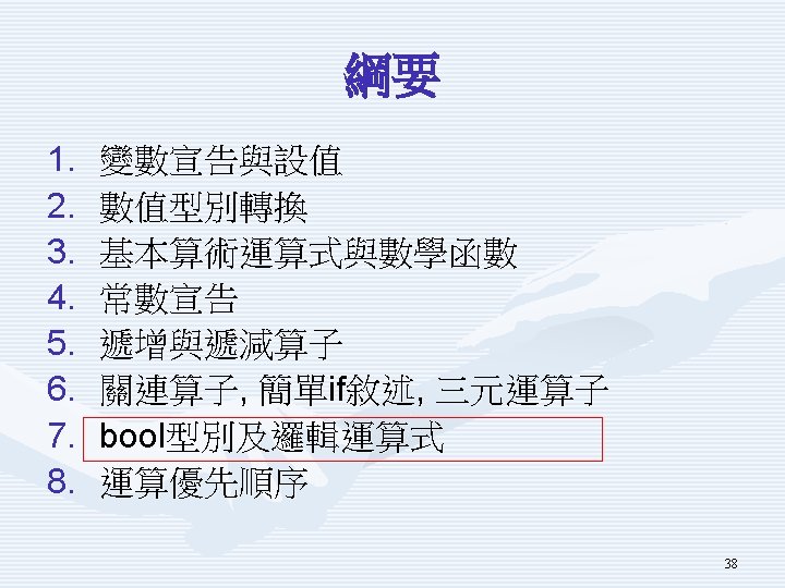 示範程式Using. Ter. Op重要片段 Console. Write( "請輸入一個小於 100的整數原始成績: "); int score = int. Parse(Console. Read. Line()); int result = score < 60 ? 60 : score; // 調分公式 Console. Write. Line("調分後成績: " + result); 37