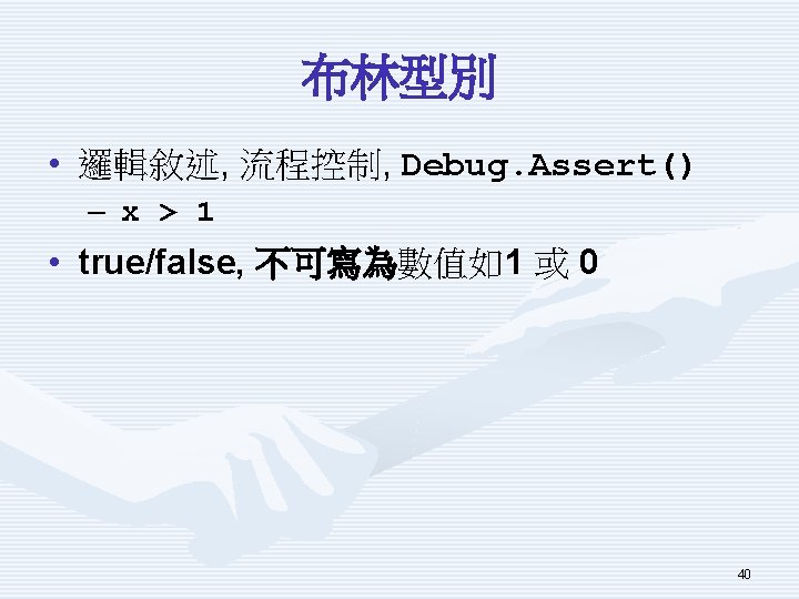 示範程式Using. LB重要片段 bool bool x = 7 > 3; y = 2 < 0; x. ORy = x | y; x. ANDy = x & y; x. Oy = (x & y) | (x | y); x. Ny = (x & y) & (x | y); 39