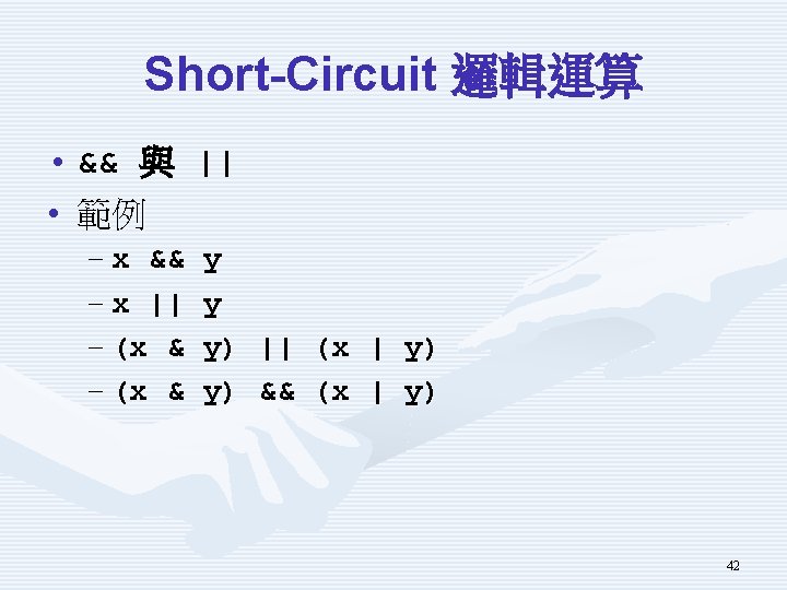 一般邏輯運算 x y x & y x | y x ^ y !y false false true false true true false 41