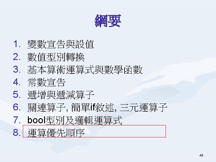 示範程式Using. Numeric重要片 段 int x = 256; Console. Write. Line("x byte y = 255; Console. Write. Line("y double z = 123. 45; Console. Write. Line("z float f = 123. 45 f; Console. Write. Line("f decimal d = 123. 45 m; Console. Write. Line("d : " + x); : " + y); : " + z); : " + f); : " + d); 7