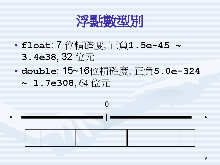 整數型別 • sbyte: -128 ~ 127 • byte: 0 ~ 255 • short: -32768 ~ 32767 • unshort: 0 ~ 65535 • int: -2147483648 ~ 2147483647 • uint: 0 ~ 4294967295 • long: -9223372036854775808 ~ 9223372036854775807 • ulong: 0 ~ 18446744073709551615 • char: U+0000 ~ U+ffff 8