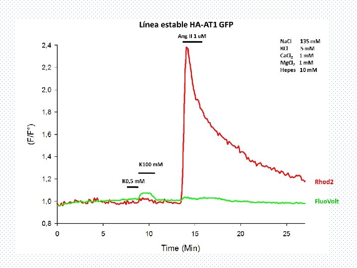 Variación de la Fluorescencia de la sonda Fluo. Volt en células transfectada con TASK 2 Ang II 1 µM K 100 m. M K 0, 5 m. M Fluo. Volt