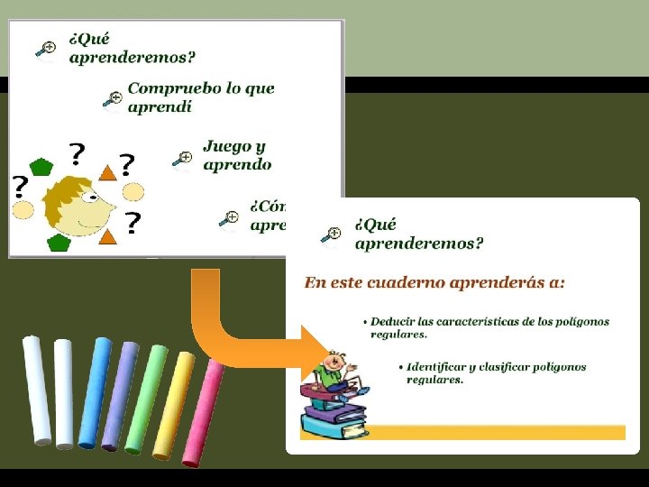 A trabajar… Actividades de salida Procesos pedagógicos Estrategias metodológicas Recursos Tiempo Evaluación Completan las hojas del cuaderno interactivo “Polígonos” en el que se pide completar los elementos de un polígono. Realizan la actividad interactiva en la que identifican los elementos de los polígonos. 10 min. Metacognición En el aula responden: - ¿Qué hicimos? - ¿Cómo lo hicimos? - ¿Cuál fue el camino que seguimos para aprender? 5 min. Transferencia Se les pide que recorten polígonos de diferentes formas y colores y compongan un personaje sobre una cartulina blanca. Hojas de colores Cartulina Blanca (Para casa)