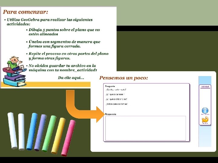 A trabajar… 3. Actividades interactivas para el aprendizaje ¿Por qué usar Cuadernia? Porque nos permite crear y proponer actividades interactivas de acuerdo a las necesidades de aprendizaje de nuestros alumnos. Porque nos permite el trabajo colaborativo entre docentes y alumnos. Porque es soporte adecuado para las actividades propuestas en geogebra.