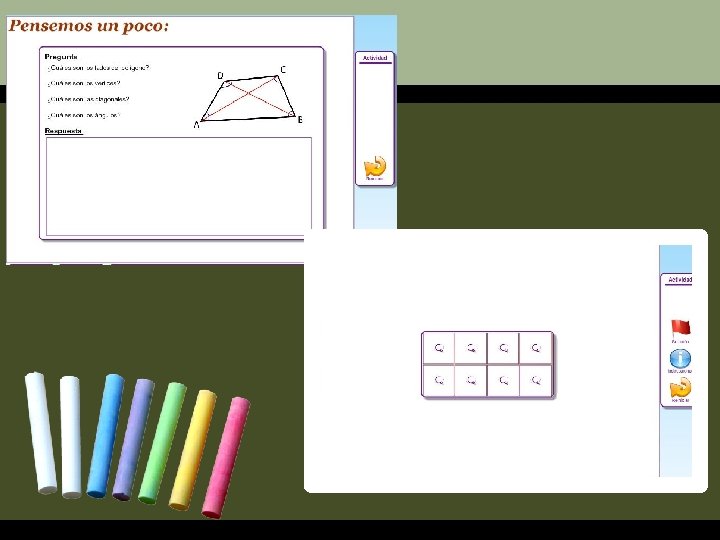 A trabajar… 3. Actividades interactivas para el aprendizaje El cuaderno interactivo “Los polígonos” Objetivo: Presentar actividades educativas interactivas que permitan a los alumnos del tercer grado desarrollar sus capacidades geométricas.