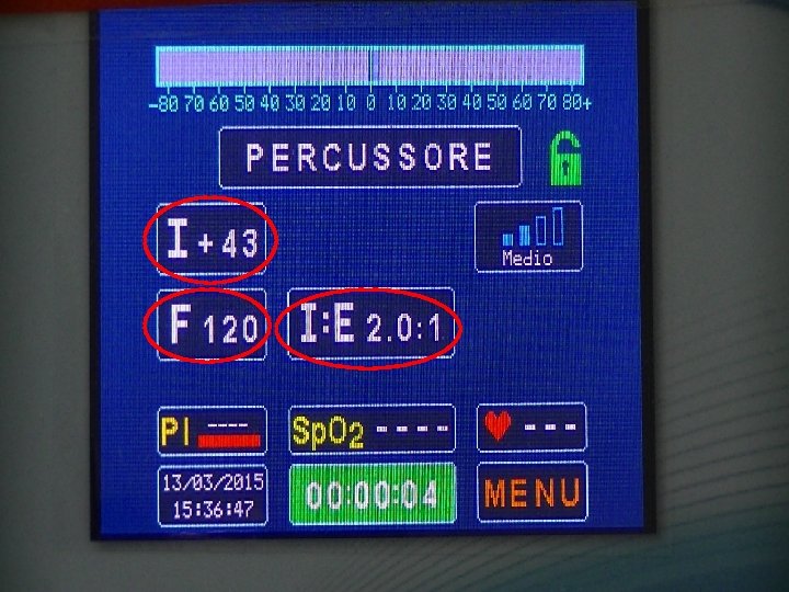 La percussione aumenta quando: • Pressione: (60 cm. H 2 O) • Rapporto In/Ex : (1: 1) • Frequenza: (250 C/min)