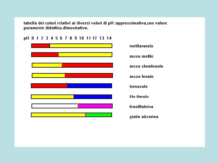 p. H viraggio e colori • Violetto metile giallo 2 violetto metilarancio rosso 4 giallo rosso metile rosso 5 giallo tornasole rosso 7 blu bromotimolo giallo 7 blu fenolftaleina incolore 9 fucsia alizarina giallo 11 rosso