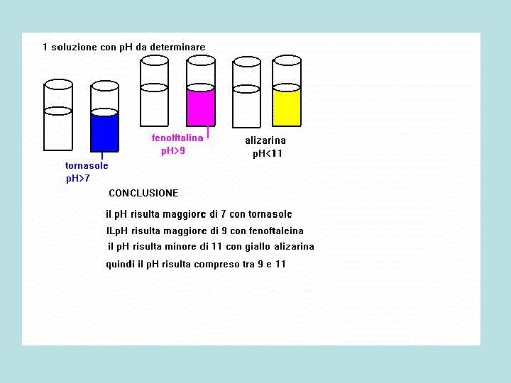 p. H<2 Sequenza ricerca p. H <2 p. H<4 Metilarancio 4 p. H>2 2 -4 Metilvioletto 2 p. H<7 Rosso metile 5 p. H<5 Bromotimolo 7 p. H>4 p. H>5 Fenolftaleina 9 4 -5 p. H<9 5 -7 7 -9 p. H>7 Alizarina 11 p. H<11 p. H>9 p. H>11 9 -11 >11