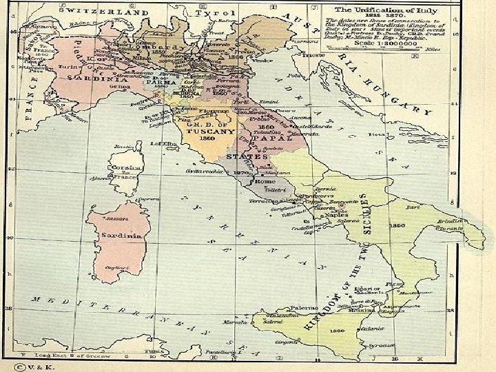 Sjednocení Itálie n n n V Itálii po neúspěšných bojích (1848 -1849) stále politická rozdrobenost Itálie zůstávala překážkou pro další rozvoj Nejvyspělejší byl sever (Sardinie a Piemont) Na vyspělosti hospodářství měl hlavní podíl ministerský předseda Camilio Benso di Cavour