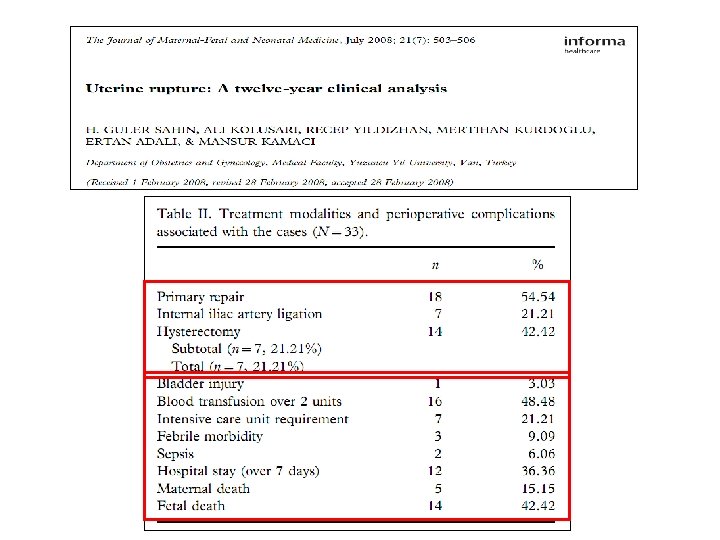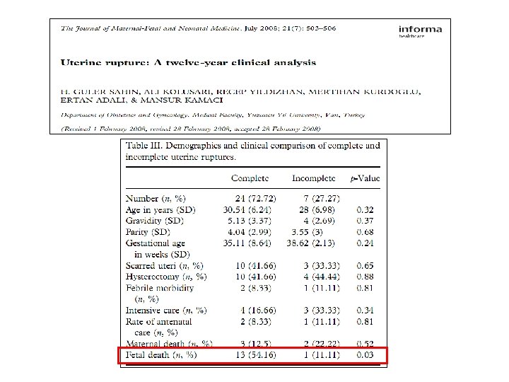 Fetal/Neonatal Ölüm 12 yılda 33 uterin rüptür, fetal ölüm 14 -%42. 42 Sahin HG, et al. Uterine Rupture. A twelve-year clinical analysis. The Journal of Maternal-Fetal and Neonatal Medicine, 21(7), 503 -506, 2008. 53 yılda 48 uterin rüptür, fetal ölüm 22 -%45 Flamm B. Once cesarean, always a controversy. Obstet Gynecol, 90: 312 -315, 1997 12 yılda 42 uterin rüptür, fetal ölüm 8 -%19 Ofir K, et al. Uterine Rupture: Risk Factors and Pregnancy Outcome. Am J Obstet Gynecol, 189: 1042 -6, 2003 3 yılda 40 uterin rüptür, fetal ölüm 13 -%32. 5 Saglamtas M, et al. Rupture of the Uterus. Int J Gynaecol Obstet, 49(1): 9 -15, 1995 Günümüzde gelişmiş ülkelerde fetal ölüm oranları % 2