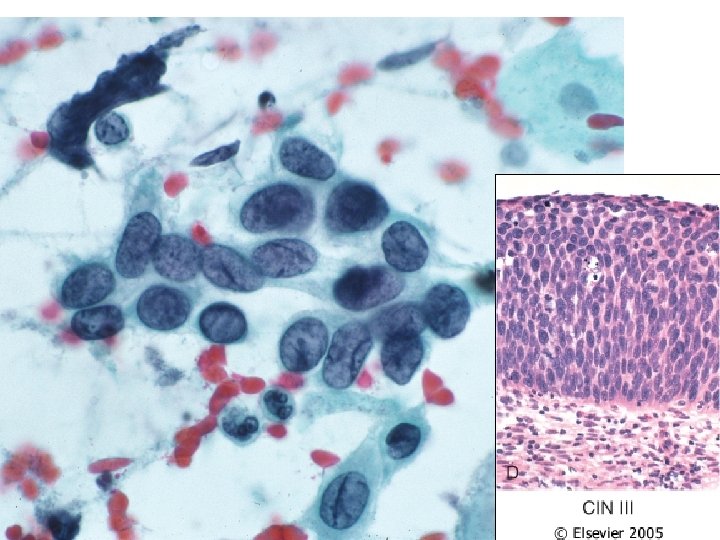 Papanicolaou Figure 22 -23 Morphology of cervical cancers. A, Squamous carcinoma. B, Adenocarcinoma in situ (lower), associated with CIN 3 (upper). C, Adenocarcinoma. D, Neuroendocrine carcinoma. Downloaded from: Robbins & Cotran Pathologic Basis of Disease (on 28 April 2008 11: 48 AM) © 2007 Elsevier