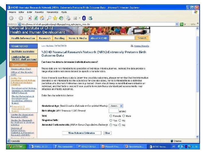CUIDADO INTENSIVO PARA PREMATURO EXTREMO: DECIDINDO ALÉM DA IDADE GESTACIONAL ¡ O prognóstico para estes RN submetidos à ventilação mecânica foi melhor predito com o uso deste 4 fatores do que com o uso somente da idade gestacional. ¡ Podemos usar estes dados para determinar os resultados individuais? Can I use the data to determine individual outcomes? (Posso usar os dados para determinar resultados individuais? )