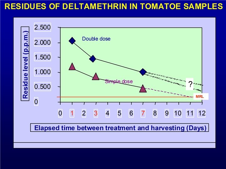 RESULTATS DOSE SIMPLE DOUBLE 1 j 2 j 3 j LAITUE 0, 29 0, 26 N. D. 0, 72 0, 35 CONCENTRATION (p. p. m. ) TOMATE 0, 30 0, 27 N. D. 0, 30 0, 47 N. D. LAITUE: 2 p. p. m. LMR (Méthomyl) TOMATE: 1 p. p. m.