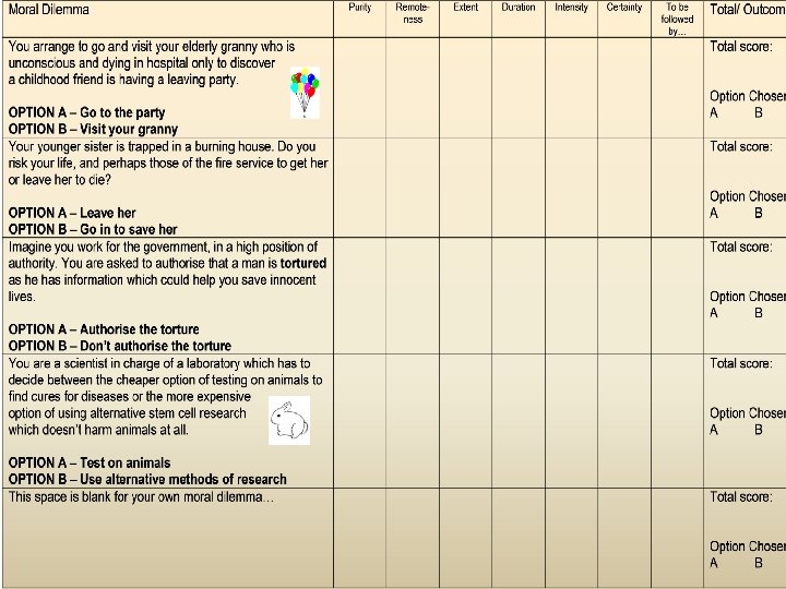 Questions to ask at each stage to decide the score given: P – Purity: Is there likely to be pain mixed with the happiness? Will it just bring about happiness or might there also be guilt or trouble for you? The less pain mixed in the better! R – Remoteness: How near is the happiness to you? Will you be able to enjoy the happiness today? Within an hour? The sooner the better! E – Extent: How widespread/ universal will the happiness be? Will other people benefit from it? Will people in future benefit from it too? The more people it brings happiness to the better! D – Duration: How long will the happiness last? A second? A day? A month? A lifetime? The longer the better! I – Intensity: How intense will the happiness be? Will it just be a fairly mild happiness or will it be very full on? The more intense the better! C – Certainty: How certain is it that happiness will be the result of the action? Can you guarantee what you do will lead to happiness? The more likely the happiness is the better! T – To be followed by: Will it produce other happiness? Will this lead to more good things happening as well? What other happiness might come of this action? The more happiness it could lead to the better!