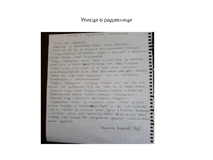 Pre nego što ću Vam ispričati utiske o danu porodice (koji smo održali juče, u petak), ispričaću Vam da mi već pola meseca praktikujemo nešto malo liči na radionice o kojima ste Vi pisali na blogu. Svake nedelje neko iz naše porodice koji je na redu treba da smisli nešto o čemu će pričati ili šta će pokazati ostalima. To može biti prezentacija o slavnoj ličnosti, osobi kojoj se neko divi, izložba knjiga ili nečega što skupljamo, u stvari, bilo šta što možemo podeliti sa porodicom. Prošle nedelje je na redu bio moj brat (pričao je o kompjuterima : ) a ove nedelje sam ja. Mislim da ću da pričam o Ani Frank. Ali, ja sam skrenula sa teme. Evo kako je izgledala naša radionica: Moj brat se u početku bunio i nije hteo da učestvuje, ali je na kraju pristao. Prvo je krenula mama, pa onda sam ja, pa tata, pa moj brat i na kraju sestra. Jedina nije učestvovala moja najmlađa sestra, jer još uvek ne zna da priča. Svi smo pričali o sebi, o omiljenom predmetu, najboljem trenutku u životu, najvećem strahu i tako dalje. (malo smo izmenili pitanja, ali nadam se da to nije problem). Intervjuisanje je počelo tako što sam ja intervjuisala mamu, moj brat tatu, i na kraju smo svi intervjuisali moju sestru. Kada smo dišli do dela da treba da izaberemo fotografiju, nismo mogli da se složimo između dve, pa smo pričali o obema fotografijama. . . Na kraju smo se zagrlili i svi zajedno fotografisali za uspomenu. Eto, tako je izgledala naša radionica. Nadam se da nisam preterala sa ovolikim mejlom, ali, kada ja jednom krenem da pričam, ne mogu da stanem. . . Veliki pozdrav od Neve! Neva Grujic 6/5
