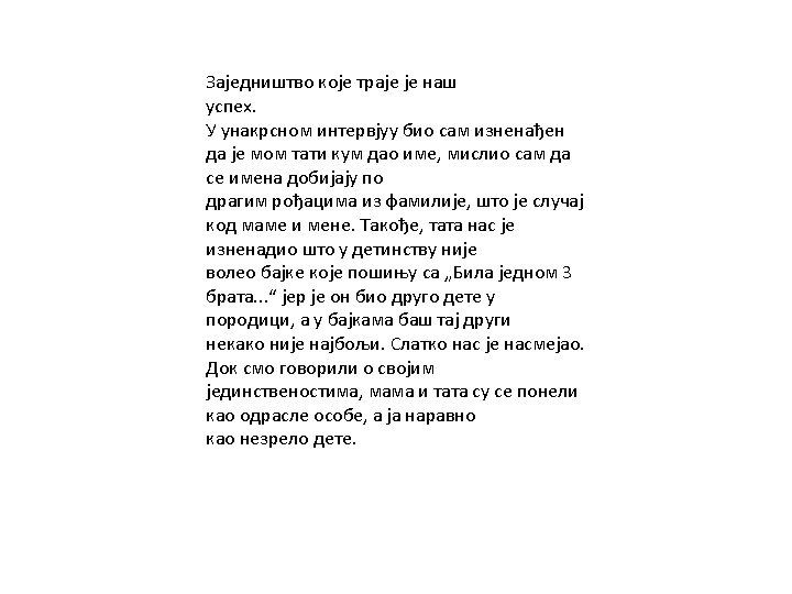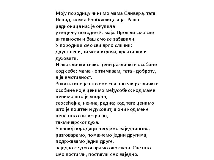 Bili smo presrećni prisećajući se divnih zajedničkih momenata. Jedino o čemu nismo govorili jeste ono u čemu smo jedinstveni i šta je ono što je posebno u vezi sa svakim članom naše porodice. To me je pokrenulo da postavim ovo pitanje svakom članu svoje porodice. Primetio sam da je bilo u stvari najteže odgovoriti na to pitanje. Za ovaj zadatak bih izdvojio ono što može biti posebno u vezi mog brata i mene. Moj brat je odličan matematičar i brz u računanju jer brojeve voli više od slova, dok sam ja odličan u pisanju, slušanju i razumevanju drugih, jer slova i reči volim više od brojeva. Na kraju, ovako različiti brat i ja, različitih interesovanja, savršeno se slažemo. Savršeno se slažemo zahvaljujući našoj porodici koja nam je usadila ljubav, koja nas je naučila kako da razumemo sličnosti, kako da razumemo i prihvatimo različitosti svakoga od nas. Jovan Denčić VI 5