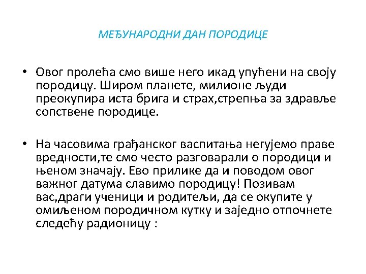 Utisci o radionici povodom Svetskog dana porodice Porodica je za mene simbol sreće, smirenosti, utehe, snage, zajedništva, timskog rada, razmene mišljenja, međusobnog razumevanja, slušanja, ćutanja, razgovora, vaspitanja, topline i ljubavi! Za mene je porodica važna i u vremenu do sada često smo meni nedostajali mi, koji činimo moju porodicu. Kako postajem stariji tako shvatam da je život borba, trka, nekada i maraton i da moji roditelji ne mogu biti uvek tu. Iako to sve shvatam, jako mi je često nedostajalo vreme sa njima, duži razgovor sa njima, smejanje sa njima… Početkom vanrednog stanja, osećao sam prvo neizvesnost zbog velikog broja raznih informacija koje sam čuo ili čitao na televiziji ili na internetu. Iz neizvesnosti nastao je strah. Ali tu je bila moja porodica. Sve je bilo lakše kada su svi oni koji je čine, tu. Tada sam shvatio koliko smo sve ove godine u nazad bili zauzeti, koliko su svi bili u žurbi, brizi i nismo stizali da budemo porodica u suštini. Imao sam puno pitanja na samom početku vanrednog stanja za moje roditelje i postavljao sam ih često. Uvek sam od roditelja dobijao detaljne odgovore i uvek sam