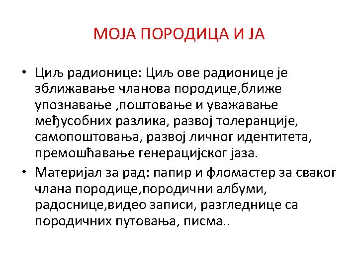 Utisci sa radionice ’’Moja porodica i ja’’ Ana Petrovic 5/2 Mislim da je svaka porodica jedinstvena na svoj način. Moju porodicu čine 4 clana. To su moji mama i tata, dve godine starija sestra i ja. Mislim da smo mi jedna dobra i složna porodica i da se puno volimo i podržavamo, što nam je pokazala i ova situacija u kojoj smo se svi iznenada našli. Odjednom kao da je vreme stalo i svi smo bili zatvoreni u kućama i počeli smo da vodimo neke druge, po malo virutelne živote. Sa svih strana dopirale su informacije o korona virusu, a odlazak u školu i druženje sa drugarima, sportske aktivnosti, zamenili su časovi sa televizije i kompjutera i komunikacija preko društvenih mreza. U takvoj situaciji moja porodica je meni pružila veliku podršku da se prilagodim novim uslovima i da razmišljem pozitivno u ovakvoj situaciji. Jedan od zabavnih trenutaka je bio dan kada smo se svi okupili i pričali o našim uspomenama, danu kada smo se sestra i ja rodile, ko nam je dao imena i zasto, našim takmičenjima, smešnim situacijama, letovanjima, zimovanjima. . Gledali smo i slike iz detinjstva i smešno mi je bilo kada sam videla koliko smo se svi zapravo promenili i koliko smo tokom vremena izgradili naš karakter i našu ličnost. Shvatili smo da je svako od nas poseban na neki svoj način. Svi smo po nečemu prepoznatljivi, različiti ili drugačiji od drugih. Svako od nas ima neku osobinu, talenat ili veštinu po kojoj je karakterističan. Moj tata koji je inače slikar kaže da mu je svaka slika umetničko delo, ali i da je svaki čovek isto tako po jedno umetničko delo, jedinstven. I svakoga treba prihvatiti i pomoći mu da otkirje svoje talente i razvije svoj identitet. Iz tog lepog popodnevnog druženja i priče shvatila sam koliko je meni i mojoj sestri porodica veoma važna i vredna i koliko smo svi jedni drugima podrška. To je nešto je najvrednije i najbolje i što je najbolji lek za svaku dobru, ali i lošu situaciju.