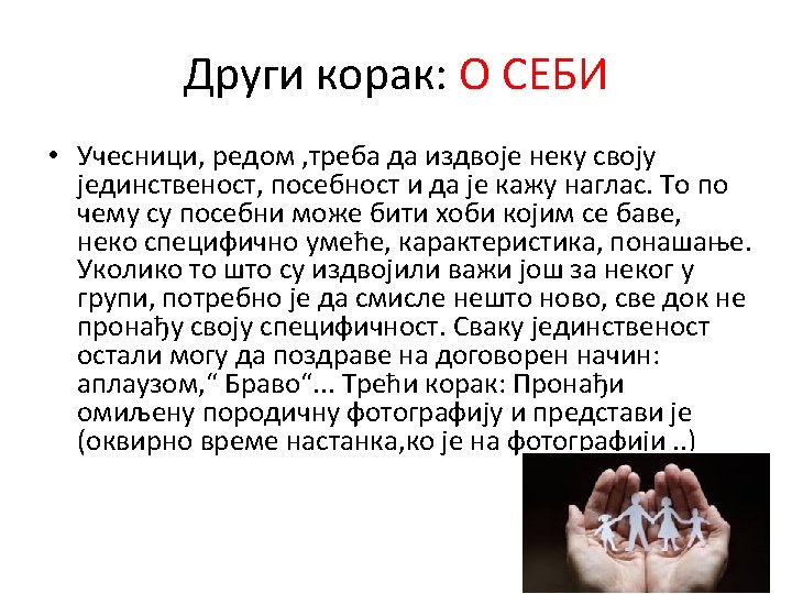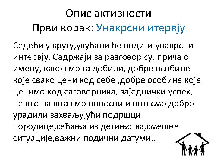 Čitajući uputstvo za radionicu, bio sam zadovoljan zbog toga što sam već pri prvom čitanju znao odgovor na svako pitanje. U stvari smo mi kao porodica za vreme ovog vanrednog stanja imali svakodnevno ovakve ili slične radionice. Ovih više od mesec dana, iskoristili smo priliku da odgledamo sve snimke od mog rođenja i rođenja mog mlađeg brata do poslednjeg nama bitnog porodičnog događaja, a to je bio rođendan moga brata u februaru mesecu ove godine. U toku našeg prisećanja divnih porodičnih momenata iz prošlosti, značajnih događaja i datuma za nas, razgovarali smo o nama kao porodici.