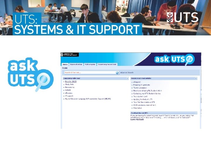 Information about UTS Systems is on the Current Student website Current student website http: //www. uts. edu. au/current-students/managing-your-course/usinguts-systems/it-support UTS Systems