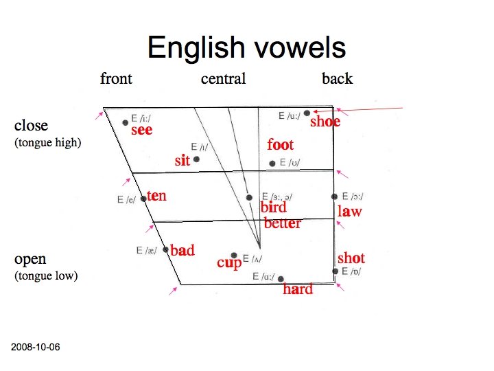 The vowel sounds of English /ı/ pit /e/ pet /æ/ pat /ʊ/ put /ʌ/ but /ə/ above /ɒ/ pot (only RP) /i: / see /3: / girl /ɑ: / father /ɔ: / door /u: / noon /eı/ face, pain /aı/ iron /ɔı/ boy /aʊ/ scout /əʊ||o(ʊ)/ boat /ıə/ hear (only RP) /eə/ bear (only RP) /ʊə/ poor (only RP, uncommon)