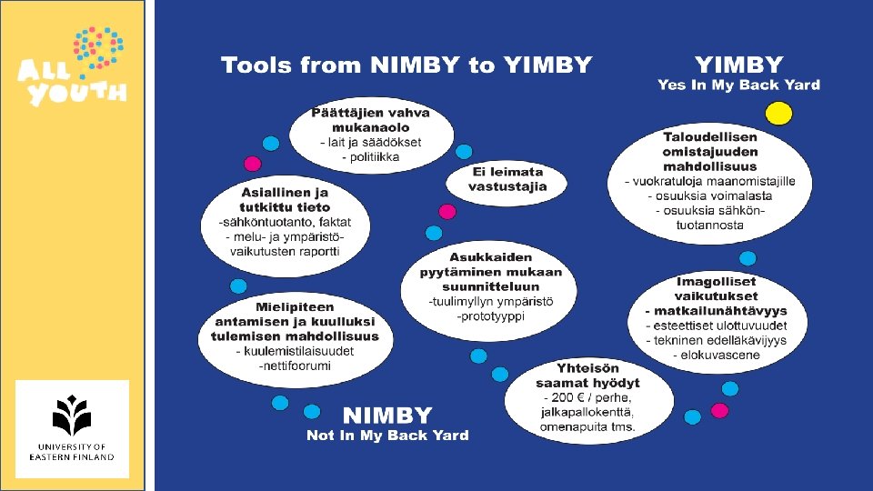 Lähteet Tekstit on luettu aikavälillä 7. 1. -7. 2. 2019 - https: //tem. fi/documents/1410877/3570111/100+prosenttia+uusiutuvaa+tarkastelu. pdf/8 e 4 ee 341 -77 c 5 -4447 -b 6 ce-1 f 2686 a 3 daec/100+prosenttia+uusiutuvaa+tarkastelu. pdf - https: //www. tiede. fi/artikkeli/uutiset/puhdas-energiakin-voi-havittaa-ymparistoa - https: //tem. fi/documents/1410877/2717655/Tuulivoimaa_edistamaan_Lauri_Tarastin_selvitys_2012. pdf/56715 f 47 -942 f-4917 9 d 13 -3 ad 7 fcfcfc 34/Tuulivoimaa_edistamaan_Lauri_Tarastin_selvitys_2012. pdf - https: //akordi. fi/? p=1959 - https: //www. hel. fi/hel 2/ksv/Aineistot/uutiset/2015/tuulivoiman-sosiaalinen-hyvaksyttavyys-helsingissa-141015. pdf - Suomalaisten asenteet ja aktiivisuus energia-asioissa, Ville Pitkänen, Jussi Westinen, 2017 - https: //docplayer. fi/7801943 -Luvia-eurajoki-lemlahden-tuulipuiston-kaavaehdotusvaiheen-melumallinnus. html - http: //santavuori. blogspot. com - http: //www. co 2 -raportti. fi/index. php? page=ilmastouutisia&news_id=2479 - https: //www. tekniikkatalous. fi/tekniikka/energia/tuulivoiman-yllattava-vaikutus-jokiin-lisannyt-nopeita-virtaaman-muutoksia vesivoimaloiden-alapuolella-luonnoton-ilmio-6753106 - https: //energia. fi/ajankohtaista_ja_materiaalipankki/energia-asenteet_2017_suomalaiset_entista_huolestuneempia_ilmastonmuutoksesta. html (2017) - https: //www. tiede. fi/artikkeli/uutiset/puhdas-energiakin-voi-havittaa-ymparistoa - https: //jyx. jyu. fi/bitstream/handle/123456789/45564/978 -951 -39 -6129 -9_vaitos 10042015. pdf? sequence=1 - https: //www. sitra. fi/hankkeet/nimby-yimby-uusi-paikallinen-paatoksentekokulttuuri/#ajankohtaista - https: //www. sitra. fi/blogit/miksi-tuulimyllyt-jakavat-kansan/ - https: //www. sitra. fi/artikkelit/osallisuus-lisaa-myonteisyytta-ja-vahentaa-vastustusta/ - https: //www. sitra. fi/uutiset/avoinkotkafi-luo-uusia-tapoja-vaikuttaa/ - https: //www. sitra. fi/artikkelit/kylla-meidan-takapihallemme-hyodynjako-ja-omistajuuden-tunne/ - https: //www. sitra. fi/blogit/vastustuksesta-myonteiseen-muutosvoimaan/ - http: //epublications. uef. fi/pub/urn_nbn_fi_uef-20171219. pdf - Wind Turbine - Materials and Manufacturing Fact Sheet, Princeton Energy Resources International, LLC (2001) - Wilburn, D. R. , 2011, U. S. Geological Survey Scientific Investigations Report 2011– 5036 - https: //sweden. se/society/energy-use-in-sweden - http: //urn. fi/URN: ISBN: 978 -952 -335 -124 -0, Sähkön tuotantokustannusvertailu Vakkilainen, Esa; KivistöAija (2017) - Haapala, K. R. and Prempreeda, P. (2014) Comparative life cycle assessment of 2. 0 MW wind turbines� ’, Int. J. Sustainable Manufacturing, Vol. 3, No. 2, pp. 170�– 185 - Kuvat: pixabay. com, free images