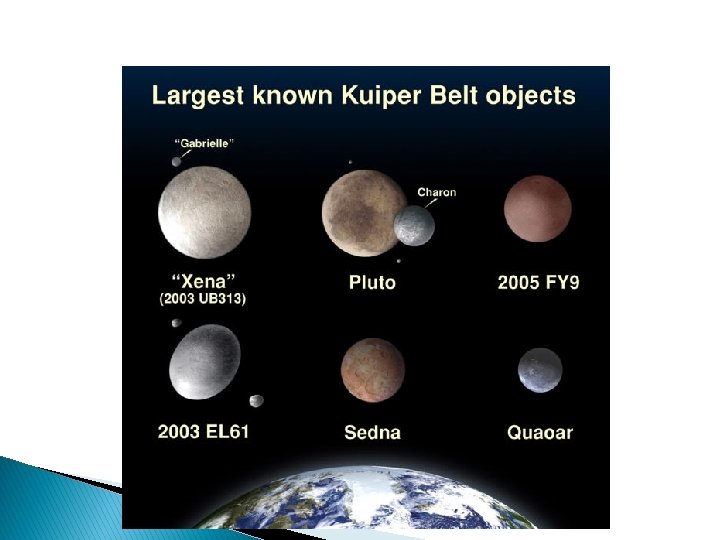 136199 Eris � Varasem tähistus 2003 UB 313, varasem mitteametlik nimi Xena. � Teatati 5. jaanuaril 2005. � Kääbusplaneet � Tiirlemisperiood on 556, 7 aastat. � Tal on vähemalt üks looduslik kaaslane. � Teadaolevatest taevakehadest kõige sarnasem Pluutole.