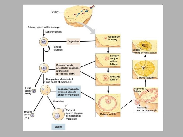 -At puberty, between 4 to 10 follicles begin to develop, although only 1 -2 are actually released. - Surrounding each oocyte is a zona pellucida, membrana granulosa, and theca cell layer. Each oocyte finishes its first meiotic division, creating a secondary oocyte and polar body, which serves no further function. - It begins the next meiosis cycle and is arrested in its second metaphase, at which point it is released from the ovary in ovulation. - It will not finish the meiosis cycle until it encounters the stimuli of a sperm.