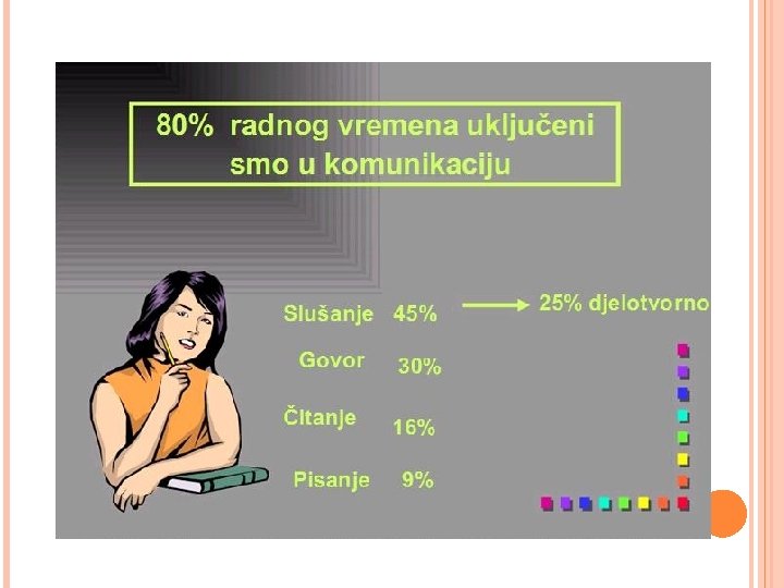 BLOKADE U KOMUNIKACIJI : filtriranje (namjerno manipulisanje informacijama) selektivna percepcija emocije jezik nesklad izmedju verbalne i neverbalne komunikacije