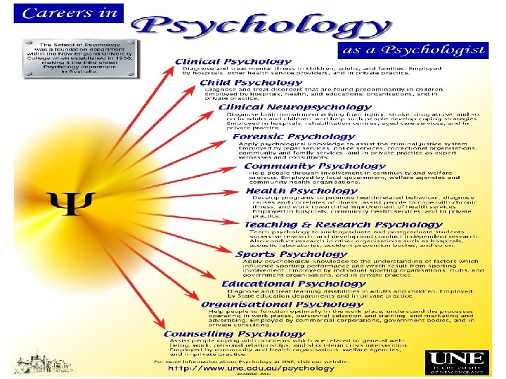 APA – područja u psihologiji n n n n n Opća Psihometrija Eksperimentalna Fiziološka Komunikacijski sustavi Razvojna Socijalna Ličnost Poremećaji n n n Terapije i intervencija Edukacijska Primijenjena (profesionalni interesi, stavovi, motivacija, selekcija, vrednovanje, gospodarenje, organizacijsko ponašanje, ekološka psi, vojna, tržište i reklama) Sportska. . .