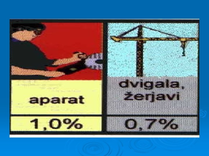 § NEVARNOSTI in OBREMENITVE NA DELOVNEM MESTU Mehanske § § § Rotirajoči in gibljivi deli strojev (vbod, udarnina, ureznina, stisk, udarec. . ). Prosto gibanje mas (padec, kotaljenje, drsenje, prevrnitev, nihanje, odletavanje…). Gibanje delovnih sredstev in vozil, zagrabitev, zaklop, poklop… Električne § Električne napeljave, stikališča, električna oprema , § Požar in eksplozija zaradi električnega toka, elektrostatični pojav Škodljive snovi § Vdihavanje, zaužitje in resorbcija / kožo, vnetljive in eksplozivne snovi § Pomanjkanje kisika, korozivne, reaktivne, nestabilne snovi Fizikalni dejavniki § Elektromagnetna sevanja, hrup, ultrazvok, vibracije, § Vroče ali hladne snovi / sredstva, snovi pod tlakom (stisnjeni zrak, para, tekočine) Izpostavljenost biogenim dejavnikom § Infekcije zaradi nenamenskega dela z mikroorganizmi