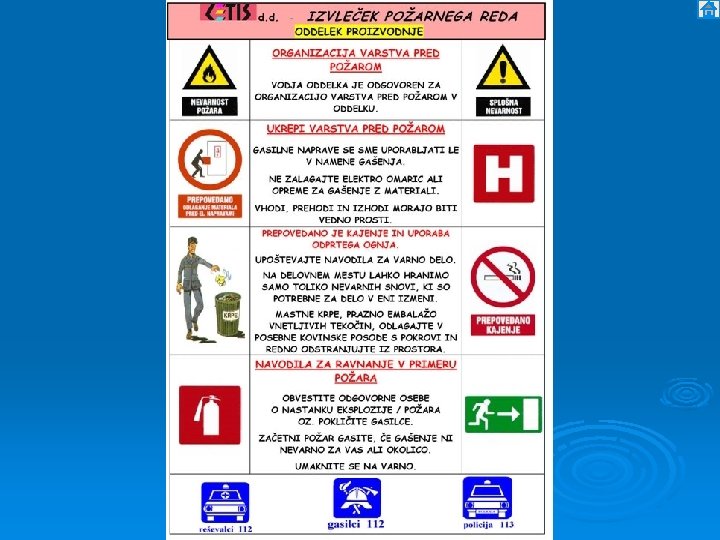 PROGRAM USPOSABLJANJA Ø SPLOŠNI DEL l l l Ø Osnove varstva pred požarom Normativi, standardi, predpisi Obveznosti delodajalca in delavca Osnove gorenja Osnove gašenja požarov POSEBNI DEL l l l l Pogoji - razmere na delovnem mestu Nevarnosti za nastanek požara Preventivni ukrepi za varstvo pred požarom Nevarnosti ob požaru, evakuacija Naprave, oprema in druga sredstva za varstvo pred požarom Praktično usposabljanje delavcev Uporaba sredstev za gašenje