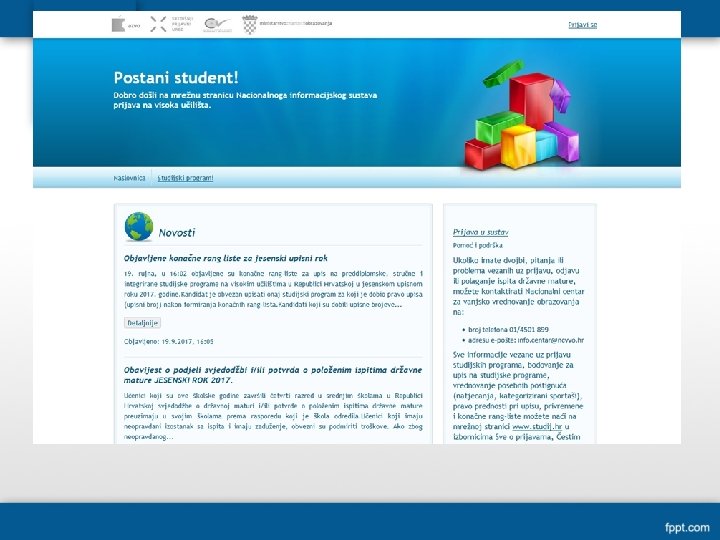 Internetska stranica • https: //www. postani-student. hr/Ucilista/Default. aspx • Prijava • Učenici koji ove godine završavaju srednje obrazovanje u redovitome sustavu obrazovanja u RH prijavljuju se elektroničkim identitetom iz sustava AAI@Edu. Hr (pero. peric@skole. hr) Prva prijava u sustav - Učenici upisuju korisničku oznaku i lozinku, polje PIN ostavljaju praznim te slijede daljnje upute (upis broja mobitela). Na upisani broj mobitela primiti će SMS poruku s PIN i TAN brojem te se nadalje prijavljuju u sustav Prijavi se/Prijava u sustav/ korisnička oznaka, lozinka, PIN