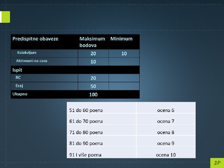 Student koji na kolokvijumu ne ostvari minimum 10 poena, na konačnom ispitu može ostvariti maksimalno 70 poena i dobiti ocenu 7 Predispitne obaveze Minimum Kolokvijum 20 Aktivnosti na casu 10 Ispit RC 20 Esej 50 Ukupno 100 10