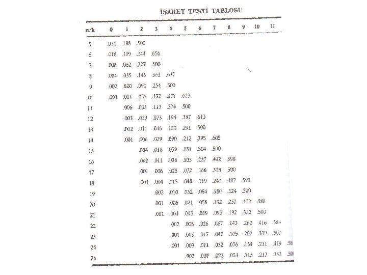 İşaret Testi N < 25 olduğunda H 0 : Kitle Ortancası = M 0 H 1 : Kitle Ortancası > M 0 H 0 : Kitle Ortancası = M 0 H 1 : Kitle Ortancası < M 0 H 0 : Kitle Ortancası = M 0 H 1 : Kitle Ortancası M 0 İşlemler : Örneklemdeki değerler Xi olmak üzere her değer için Xi- M 0 > 0 için (+) Xi- M 0 < 0 için (-) işareti verilip Xi- M 0 = 0 olanlar analizden çıkarılır ve denek sayısı o kadar azaltılır. Test İşlemi : k, en az sayıda gözlenen işaret sayısı ve n, denek sayısı olmak üzere işaret test tablosundan, n ve k değerine karşılık gelen olasılık değeri bulunur: 60