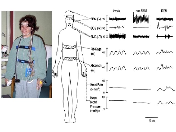 REM Uyku Evresi v Hızlı göz hareketleri ile nitelidir v Yavaş dalga uykusundan geçişle uykunun 2. yarısında sıklığı ve süresi artan vucudun aktif olduğu bir süreçtir v EEG’de desenkronizasyon gözlenir. Hızlı ve düşük voltajlı aktivite uyanıklığa benzer v Beyin kan akımı ve oksijen tüketimi belirgin artar v Çizgili kaslarda (oküler kaslar, m. stapedius ve solunum kasları hariç) atoni görülür v Periyodik penil ve klitoral ereksiyonlar görülür v Kan basıncı, nabız, solunum düzensizlikleri görülür, serebral kan akımı, ve BOS basıncı artar v Eksternal çevresel faktörlerle uyanmak zordur, buna karşın spontan uyanmalar sıktır “paradoksal uyku” (internal uyaranlara hassasiyet)