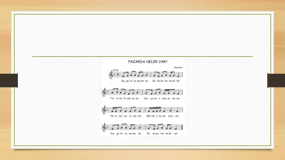• “Pazarda Neler Var? ” adlı şarkının sözlerini tahtaya yazınız. Şarkının • • • içinde geçen meyve isimlerinden oluşan küçük bir tekerleme oluşturunuz ve vuruşlarını yaparak bu tekerlemeyi öğrencilerinize söyletiniz. Daha sonra şarkıyı öğrencilerinize öğretiniz. Mandalina muz, Elma portakal, Mandalina muz. Tekerlemenin vuruşları