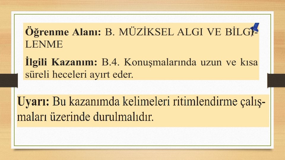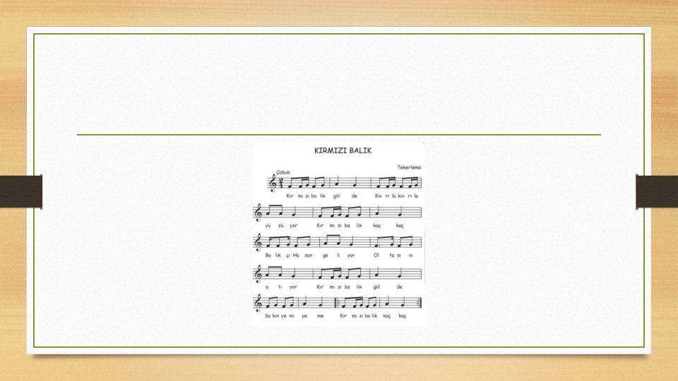 • Kırmızı Balık” ve “Pazarda Neler Var? ” isimli şarkıları inceleyelim. Şarkı sözlerin deki kısa ve uzun süreli heceleribulup, nokta ve kısa çizgi işaretleri ile belirleyelim.