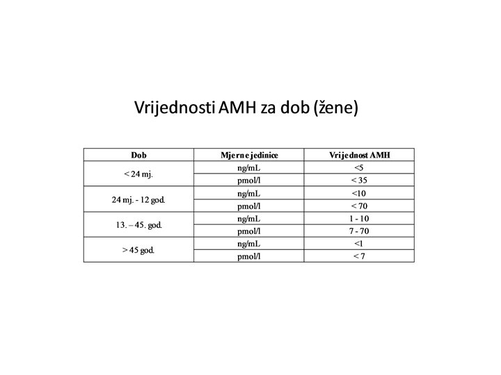 ANTIMÜLLEROV HORMON • Glikozilirani peptidni hormon • Granuloza stanice primarnih folikula • Vrijednost AMH korelira s brojem malih antralnih folikula • Biljeg broja folikula