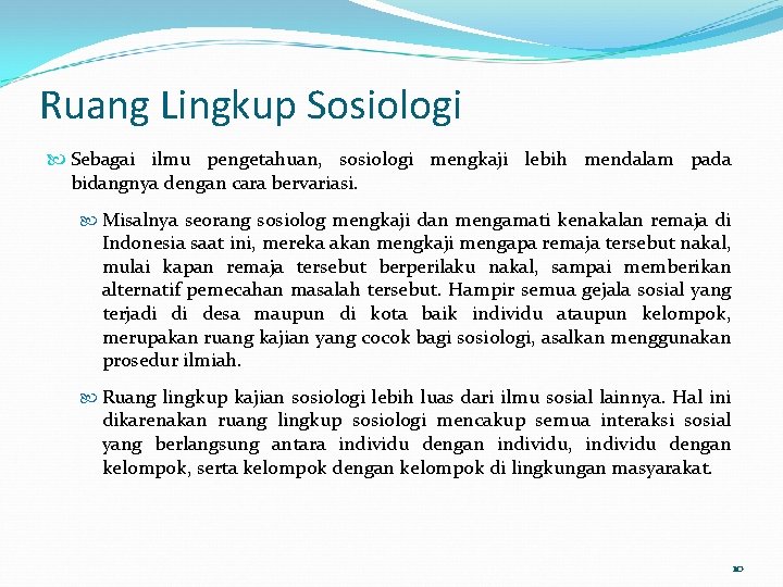 Ruang Lingkup Sosiologi Sebagai ilmu pengetahuan, sosiologi mengkaji lebih mendalam pada bidangnya dengan cara bervariasi. Misalnya seorang sosiolog mengkaji dan mengamati kenakalan remaja di Indonesia saat ini, mereka akan mengkaji mengapa remaja tersebut nakal, mulai kapan remaja tersebut berperilaku nakal, sampai memberikan alternatif pemecahan masalah tersebut. Hampir semua gejala sosial yang terjadi di desa maupun di kota baik individu ataupun kelompok, merupakan ruang kajian yang cocok bagi sosiologi, asalkan menggunakan prosedur ilmiah. Ruang lingkup kajian sosiologi lebih luas dari ilmu sosial lainnya. Hal ini dikarenakan ruang lingkup sosiologi mencakup semua interaksi sosial yang berlangsung antara individu dengan individu, individu dengan kelompok, serta kelompok dengan kelompok di lingkungan masyarakat. 10